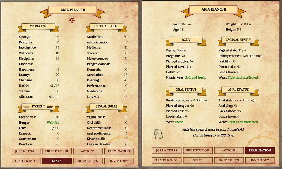 Aris starts fit, intelligent, strong willed, good looking, and well educated for her age - her primary focus has obviously been military so far though.