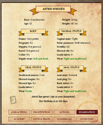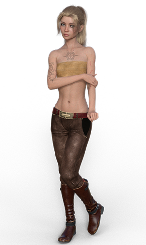 Astrid is an orphan from a proud Scandie family reduced to poverty, who grew up as farm laborer in the rice fields surrounding Burakumin village. She was illegally enslaved by the Black Scorpion gang, then sold to be the sex toy of a perverted bandit called Duncan, with whom she may be discovered by the MC. Immediately falling for her powerful rescuer, she offers herself as loot, preferring a life of slavery with a rich warlord to going back to poverty and insecurity as a farm laborer.