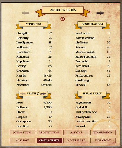 Astrid starts with low Strength and Willpower, but high Dexterity, Beauty, Charisma and Survival skill. She is also talented at Acrobatics and Dancing.
