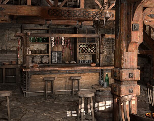 You can have one Carousing session here per day, consisting of a selection of the above. You can drink alone with your followers (3 hours), or buy drinks for everyone at the bar (3 hrs), or do both at the same time ($50 and 3 hrs, not $54 and 6 hrs), or have a meal (1 hr), or a meal and drinks (4 hrs). You can also optionally gamble (3 hrs), and/or socialise with the clientele and staff (1 hr) - though you can only do these latter if you first buy drinks or a meal. So Carousing at Divine Juices will take from 1 to 8 hours depending on your choices.