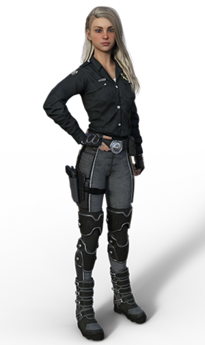 Ellen Shaw is down-on-her luck former Skyguard police officer that you meet as she is being evicted from her apartment on account of being way behind on her rent payments. She is the sole daughter of SGPD detective Elijah Shaw, whose footsteps she followed in, joining the Skyguard militia at 15. Her and her father's ironclad sense of justice led to her current misfortune.