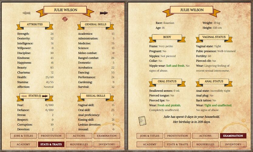 She is good-looking and charismatic, with high Medicine skill, and quite good at dancing. She is moderately intelligent and kind, but with low willpower, and physically weak and timid, though has some ability to fire a gun, and moderate survival skills. An example of her starting stats is shown below.