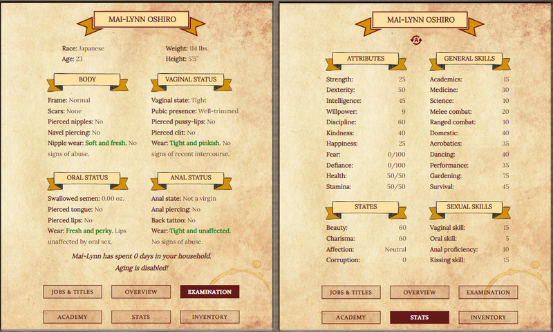 0.8.0.1 initial stats for Mai-Lynn. Includes +10 discpline from perfectionist since she always has that trait