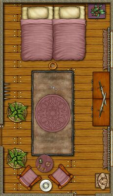 "Excessive luxury. A huge bed for all types of orgies, expensive furniture, and master crafted closets that would prove satisfactory even for a noblewoman. The room also offers prominent guests or loving partners a pair of comfortable chairs at a decorated whiskey table."